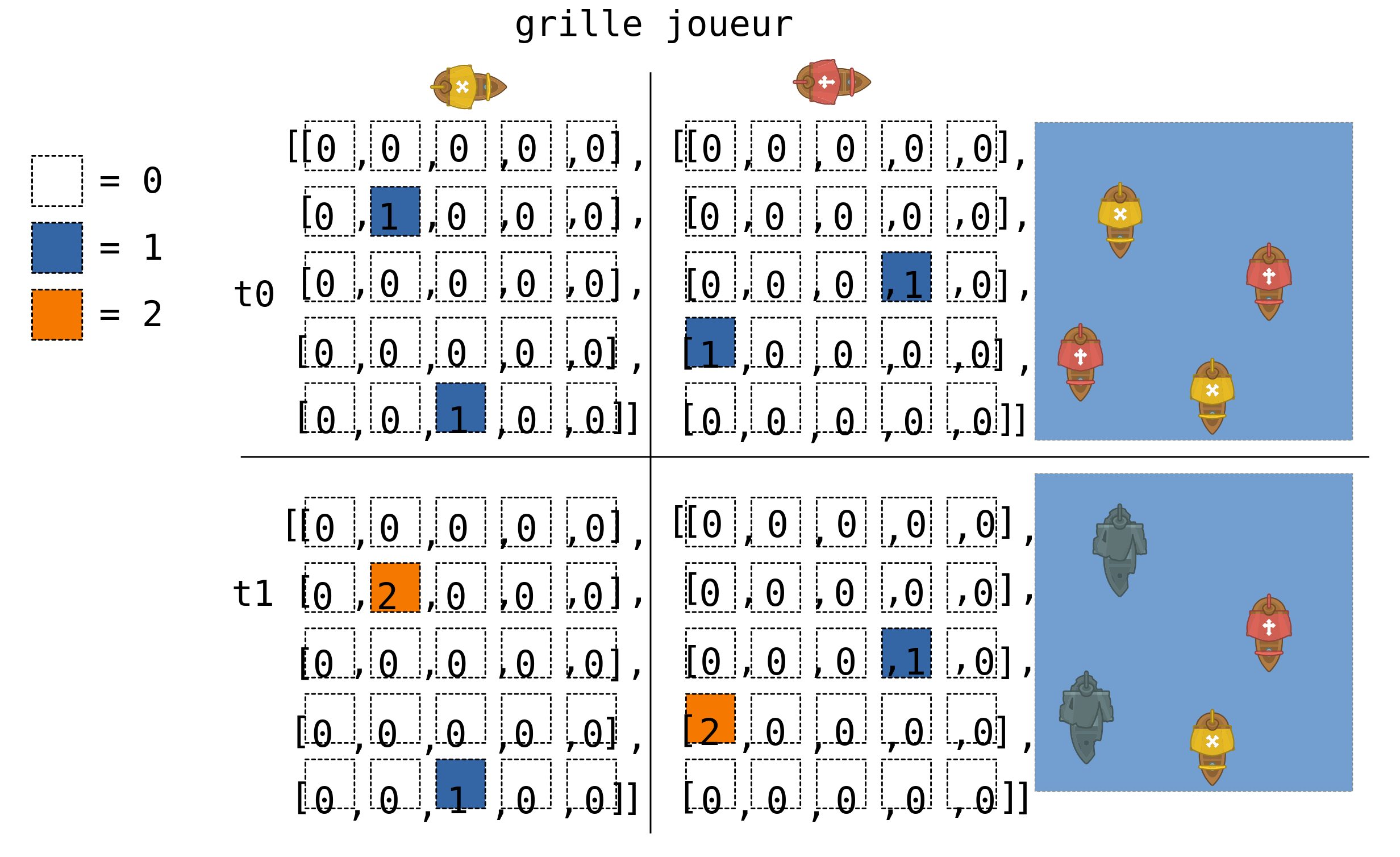 - gérer l’état des bateaux par un code dans une matrice 2D (0 = vide, 1=bateau, 2 = coulé, 3 = tir raté)