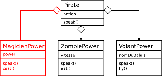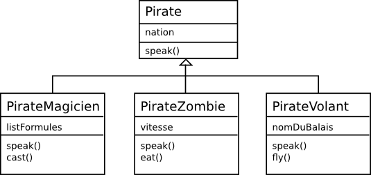 Si nous revenons à l'exemple du pirate dans le cadre de l'héritage vu tout à l'heure, le polymorphisme est possible du fait que nous pouvons utiliser n'importe quel fonction speak() ou nation sans forcément savoir si ce qu'il y a dans la liste c'est un PirateZombie ou un PirateVolant. Cette notion est extrement importante car elle permet d'avoir des comportements génériques.