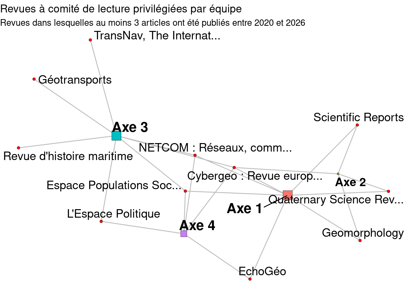 # construction des noeudsso <-read_tsv("data/so_rev.tsv")v <-bind_rows(attr, so) %>%mutate(col =case_when(node %in%"Axe 1"~"forestgreen", node %in%"Axe 2"~"blue", node %in%"Axe 3"~"purple", node %in%"Axe 4"~"gold",TRUE~"grey"))# construction des classesbipi <- bip %>%left_join(so, by =c("SO"="node")) %>%distinct(SO, equ, type) %>%relocate(SO, 1)# construction des relationsv <-distinct(v, node, type, col)# construction du grapheslibrary(igraph)g <-graph_from_data_frame(bipi, directed = F, vertices = v)# symboliser les évènements par des carrés et les individus par des cerclesV(g)[V(g)$type %in%"journal"]$shape <-"square"V(g)[!V(g)$type %in%"journal"]$shape <-"circle"# choisir deux gammes de couleur pour bien distinguer les deux ensembles de sommetsV(g)$color <- v$col[match(V(g)$name, v$node)]V(g)$label <-ifelse(V(g)$shape %in%"square", str_trunc(V(g)$name, 14), NA)l <-layout_with_fr(g)# library(ggplot2)library(tidygraph)library(ggraph)g %>%ggraph(layout ="fr") +geom_edge_link(edge_colour ="grey") +geom_node_point(aes(filter = type %in%"journal"), show.legend = F, shape =21, fill ="red", stroke =0.2) +geom_node_point(aes(filter =! type %in%"journal", size =degree(g), fill = name), show.legend = F, shape =22, stroke =0.2) +geom_node_text(aes(label =ifelse(type %in%"journal", str_trunc(name, 25), name), fontface =ifelse(! type %in%"journal", "bold", "plain"), size =ifelse(degree(g) >=5, 7, 6)), colour ="black", repel = T, show.legend = F) +# , repel = TRUE, min.segment.length = Inf, max.overlaps = Inftheme_void() +scale_size(guide="none") +labs(fill =c("Equipe"),title ="Revues à comité de lecture privilégiées par équipe",subtitle ="Revues dans lesquelles au moins 3 articles ont été publiés entre 2020 et 2026")
