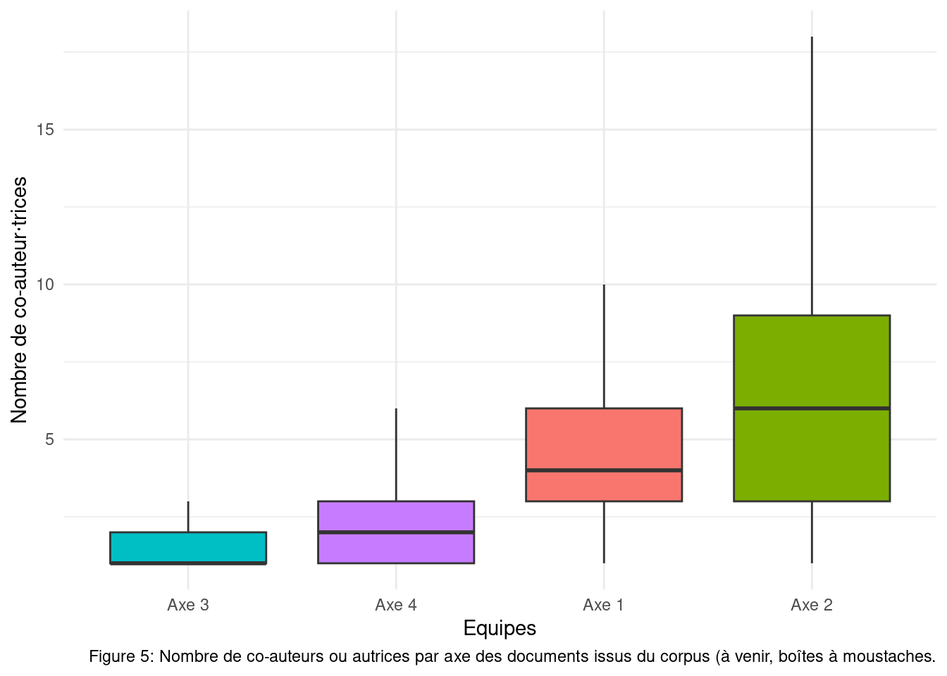 library(ggplot2)library(scales)require(readr)coaut_equi <-read_tsv("stats/coaut.tsv")# ggplot(coaut_equi, aes(x = equ, y = mean_coaut, fill = coaut)) +# geom_bar(stat = "identity") +# xlab("Équipes") +# ylab("Nombre moyen de co-auteur⋅rices") +# labs(caption = "Figure 5: Nombre de co-auteurs ou autrices par axe des documents issus du corpus (à venir, boîtes à moustaches.") +# theme_minimal() +# guides(fill = guide_legend(title = "% documents\n avec co-auteur⋅\nrices", reverse=T)) +# scale_fill_continuous(high = "#132B43", low = "#56B1F7")coautequ <- pub %>%unnest(equ) %>%select(equ,nbaut)ggplot(coautequ, mapping =aes(x =reorder(equ,nbaut), y = nbaut, fill = equ)) +geom_boxplot(outliers =FALSE) +xlab("Equipes") +ylab("Nombre de co-auteur⋅trices") +labs(caption ="Figure 5: Nombre de co-auteurs ou autrices par axe des documents issus du corpus (à venir, boîtes à moustaches.") +theme_minimal() +theme(legend.position="none")