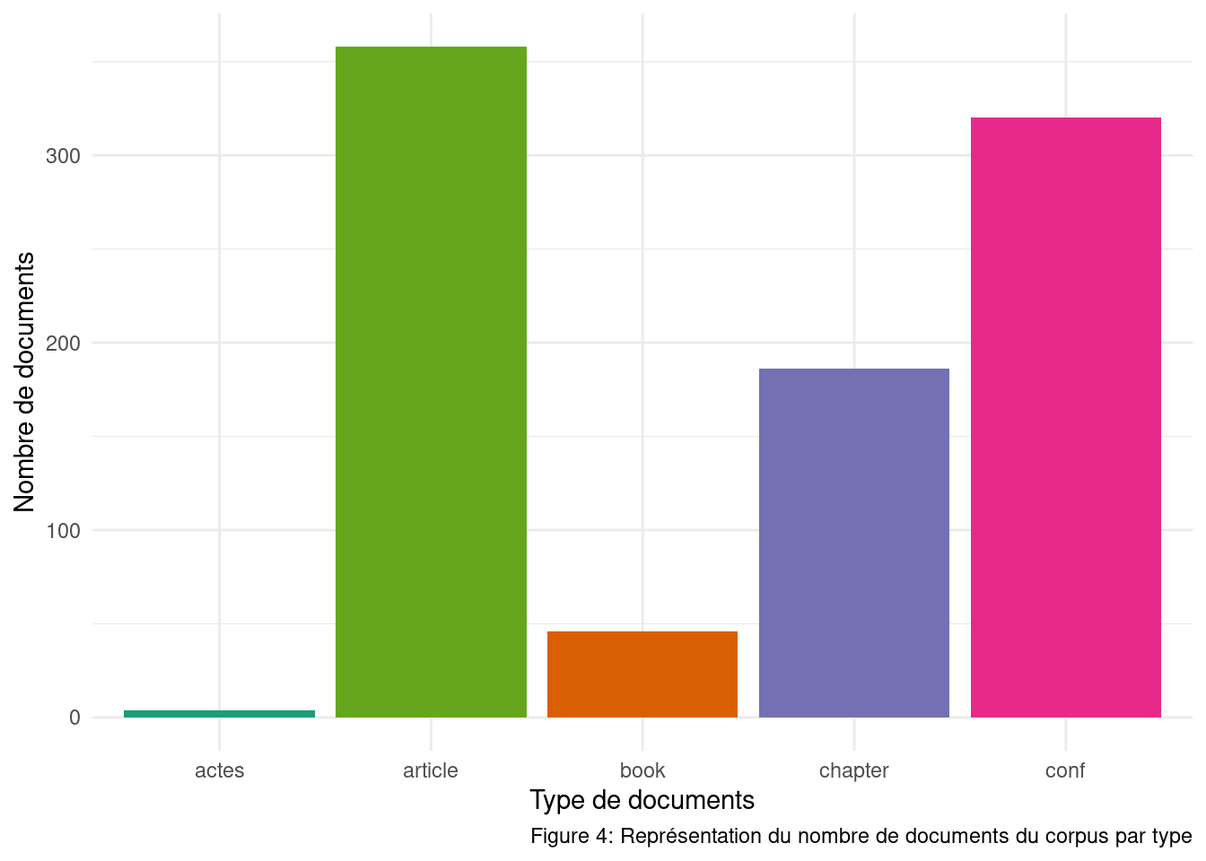 Parmi l’ensemble des productions scientifiques (voir le tableau 1.1 dans la note 1.1), l’étude limite le corpus des publications aux types suivants : article à comité de lecture, conférence, actes de colloques, numéro spécial de revue, ouvrage, chapitre d’ouvrage.