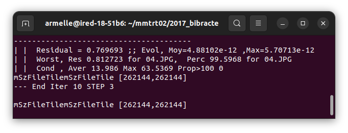 - Fichier Residus.xml : erreurs résiduelles (décalage des points homologues entre les images) exprimées en pixel ; paramètre à retenir en fin de fichier : AverageResidual qui doit se situer entre 0.5 et 1. Cette information se trouve également dans le terminal.